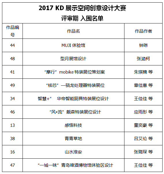 根据2017KD展示空间创意设计大赛的评审规则,所有初评入围参赛者须提交相关资料方可参与总决赛,相关材料提交说明将另做通知,请留意大赛报名邮箱及浙江省文化创意产业协会官方网站公告。